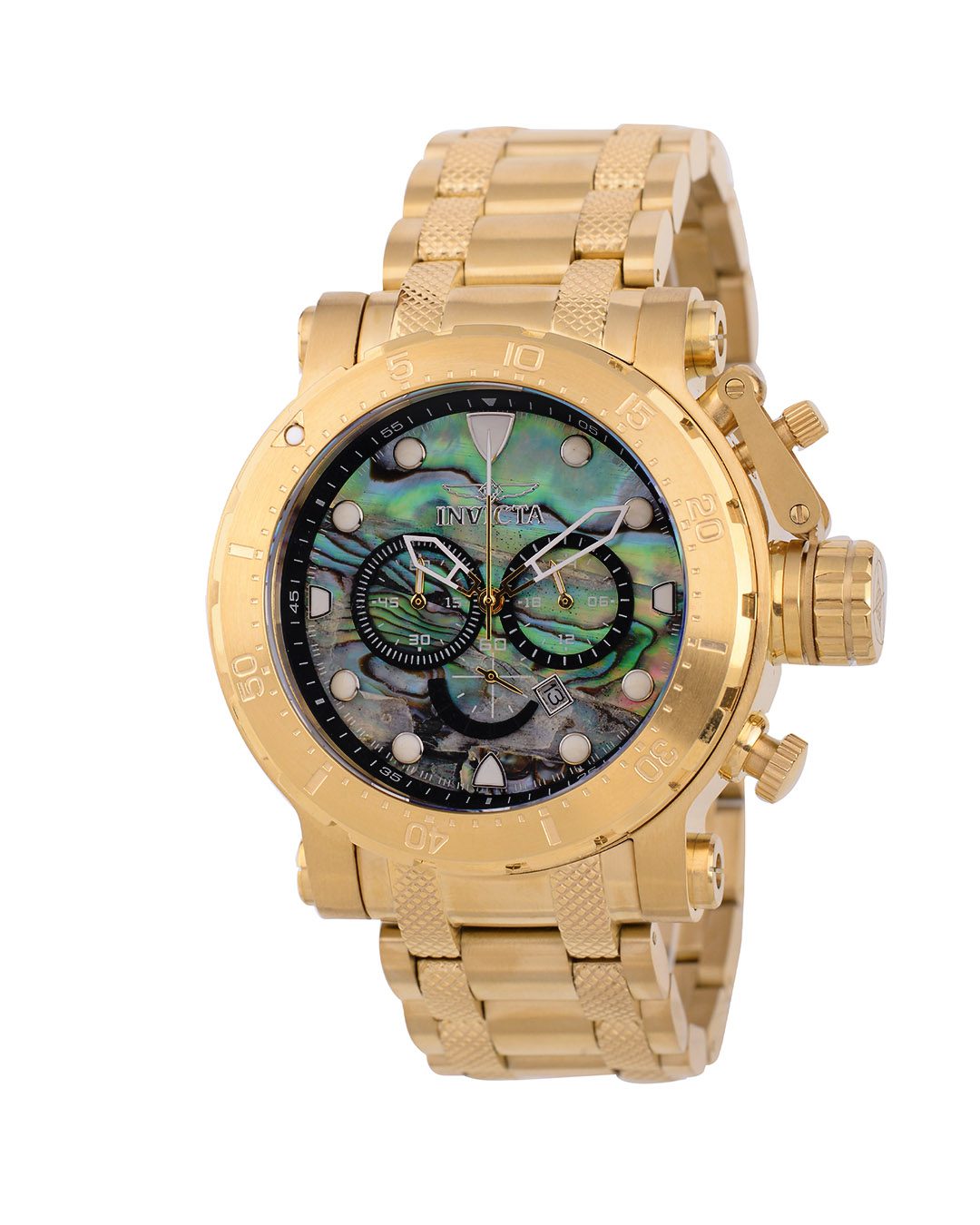 بهترین کیفیت موجود در بازار (های کپی درجه یک) موتور ساخت زاپن با کیفیت عالی دارای سه موتور فعال و کرنومتر دارای نشانگر: تاریخ ، دقیقه شمار کرنومتر و روز های هفته مقاوم دربرابر آب (در حد پاشش آب) تمام استیل ضد زنگ ، رنگ ثابت و ضد حساسیت شیشه آنتی رفلکس ضد خش قطر صفحه : 52 میلیمتر ضخامت ساعت : 18 میلیمتر وزن ساعت : 340 گرم رنگ های به کار رفته : طلایی ، صدفی مناسب دور مچ تا 240 میلیمتر به همراه جعبه چوبی شیک مارک اینویکتا دارای یکسال گارانتی تی تی بول