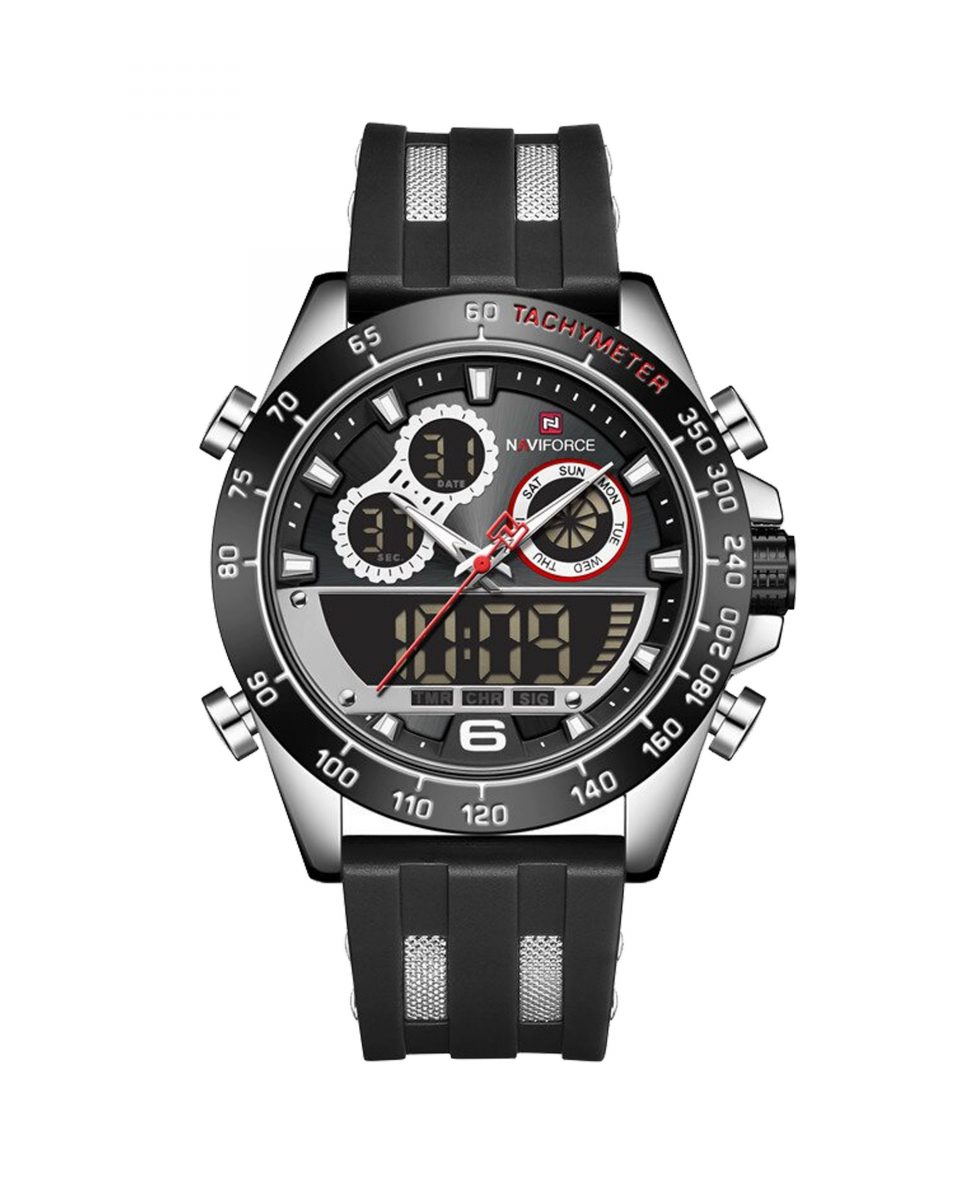 اورجینال و شرکتی با ضمانت اصالت موتور کوارتز ساخت ژاپن با کیفیت عالی دارای نشانگر تاریخ و ساعات شبانه روز و روزهای هفته و روزهای ماه و کرنومتر بند پلاستیکی مقاوم و ضد حساسیت شیشه معدنی مقاوم در برابر خش مقاوم در برابر آب‌ (در حد پاشش آب) قطر صفحه : 46 میلیمتر ضخامت ساعت : 16 میلیمتر وزن ساعت : 123 گرم مناسب دور مچ تا 210 میلیمتر رنگ های به کار رفته : مشکی ، سیلور ، قرمز به همراه جعبه و پاکت شیک مارک ناوی فورس دارای یک سال گارانتی شرکت تی تی بول