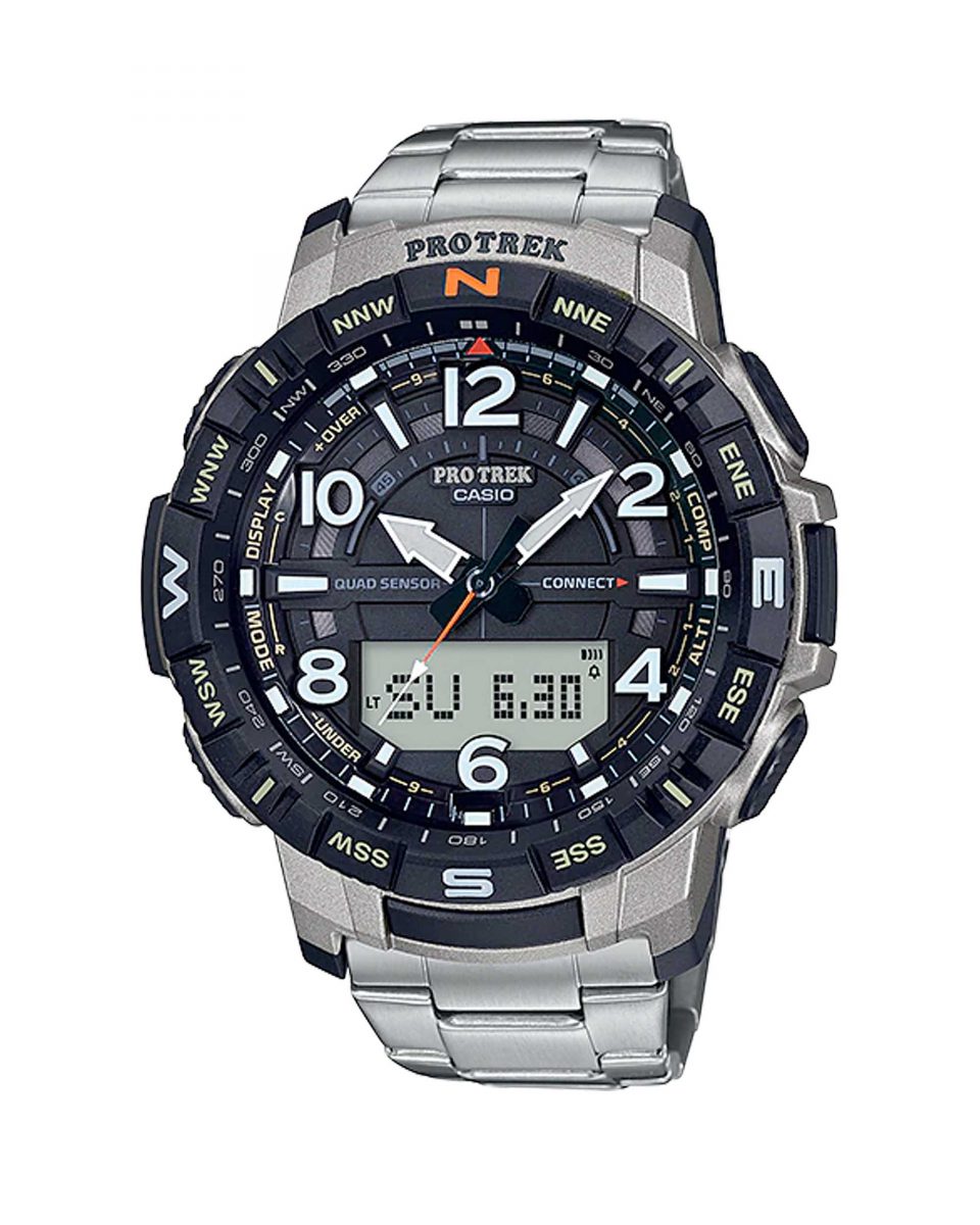 مدل جدیدی با بند تیتانیوم از خط محصول PRT-B50 از مدل‌PRO TREK دارای حسگر چهارگانه (موقعیت‌یابی، ارتفاع/ فشار بارومتری، دما، گام‌شمار) و Smart Phone Link معرفی می‌شود. بند این مدل جدید از آلیاژ تیتانیوم سبک‌وزن، با مقاومت زیاد دربرابر زنگ‌زدگی و با حساسیت‌زایی کم ساخته شده است. این ساعت هم برای پوشیدن هنگام فعالیت‌های خارج از ساختمان و هم برای فعالیت‌های هر روزه طراحی و ساخته شده است. مدل PRT-B50T دارای رنگ‌آمیزی تک‌رنگ ساده است که با رنگ نارنجی عقربه ثانیه‌شمار و جهت شمال روی قاب چرخان متعادل شده و نه تنها نمایان بودن آن را بیشتر کرده بلکه تزئیناتی جذاب به آن افزوده است. اعداد بزرگ لاتین روی صفحه چندبعدی باعث می‌شود زمان به آسانی و با یک نگاه خوانده شود و ترکیب قسمت‌های فلزی به ساعت ظاهری باشکوه و دارای کیفیت بخشیده است. در قسمت پشت بدنه که از رزین مرغوب ساخته شده از فیبرهای شیشه سبک‌وزن و مستحکم در ساختاری استفاده شده که اتصال قطعات بند را یکپارچه می‌کند و محافظ‌های دکمه آن را از خطاهای عملکردی محافظت می‌کنند. همه این ویژگی‌ها به استحکام این مدل می‌افزایند. قاب چرخان بزرگ ساعت کار کردن با آن را در فضای باز آسان می‌کند حتی با وجود پوشیدن دستکش، و به ظاهر وحشی این طرح می‌افزاید. قابلیت‌های اصلی ساعت مچی سیستم حسگر چهارگانه از حسگرهای فشرده‌ای استفاده می‌کند که ترکیب قابلیت‌های قطب‌نما، بارومتر/ارتفاع‌سنج، دماسنج و قدم‌شمار را در یک پیکربندی فشرده امکان‌پذیر کرده است. همه این قابلیت‌ها به شما کمک می‌کند هنگام کوهنوردی یا صخره‌نوردی سرعت حرکت خود را کنترل کنید و برنامه‌های بهینه‌ای برای همه فعالیت‌های فضای باز شما تولید می‌کند. قابلیت قدم‌شمار بازخورد مهمی درباره نتایج پیاده‌روی روزانه و دیگر جنبه‌های یک زندگی پرتحرک ارائه می‌دهد.