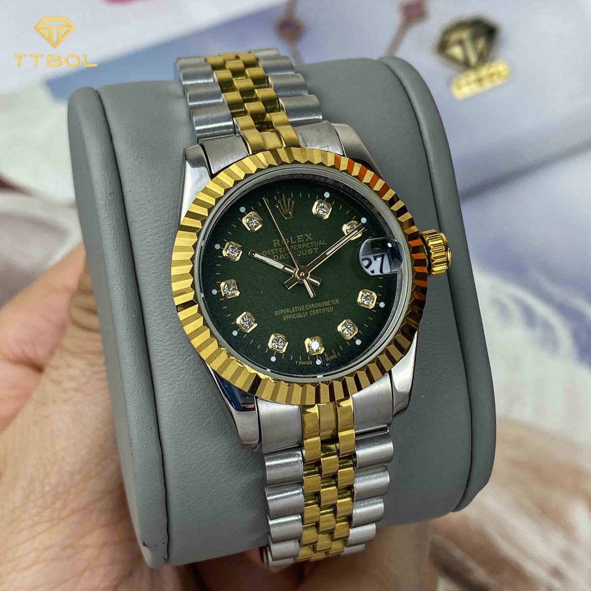 بهترین کیفیت موجود در بازار (ها کپی درجه یک) موتور کوارتز ساخت ژاپن دارای نشانگر تاریخ شیشه معدنی مقاوم در برابر خش مقاوم در برابر آب (در حد پاشش آب) قطر صفحه : 32 میلیمتر ضخامت ساعت : 12 میلیمتر وزن ساعت : 82 گرم رنگ های به کار رفته : سیلور ، طلایی ، سبز به همراه جعبه چوبی شیک مارک رولکس دارای یک سال گارانتی شرکت تی تی بول